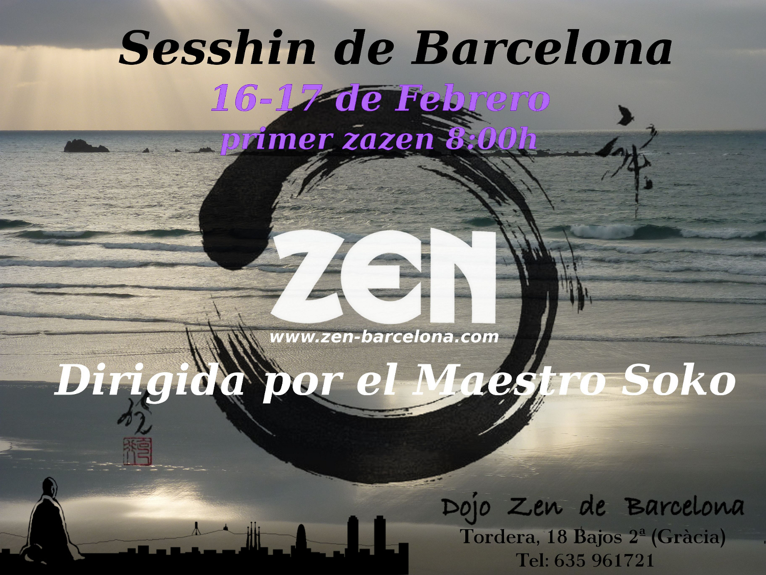 Cette sesshin aura lieu du samedi 16 février (arrivée la veille au soir), au dimanche 17 février 2013, à Dojo zen de Barcelone.